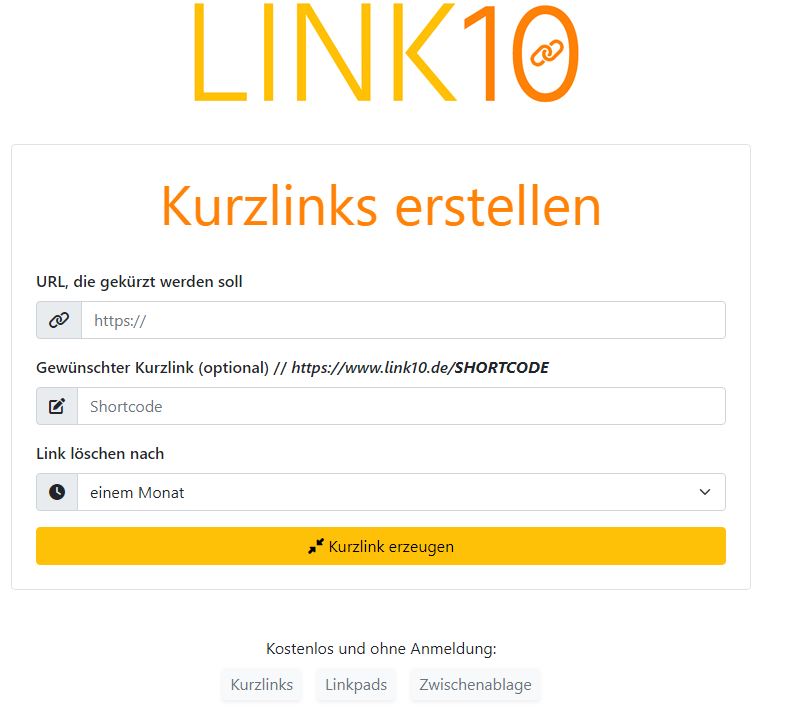 LINK10.de ist kostenlos und erfordert keine Anmeldung. Der Serverstandort des Online-Tools ist in Deutschland.