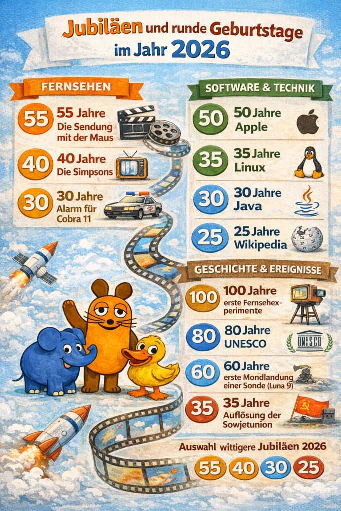 Das Jahr 2026 bietet reichlich Stoff für Rückblicke. Zahlreiche runde Jubiläen laden dazu ein, Erfolge zu würdigen, Entwicklungen einzuordnen und historische Wegmarken neu zu betrachten. Von berühmten Geburtstagen über Fernsehklassiker bis hin zu Technik-Meilensteinen und weltpolitischen Ereignissen spannt sich ein weiter Bogen, der zeigt, wie sehr Vergangenheit und Gegenwart miteinander verwoben sind.