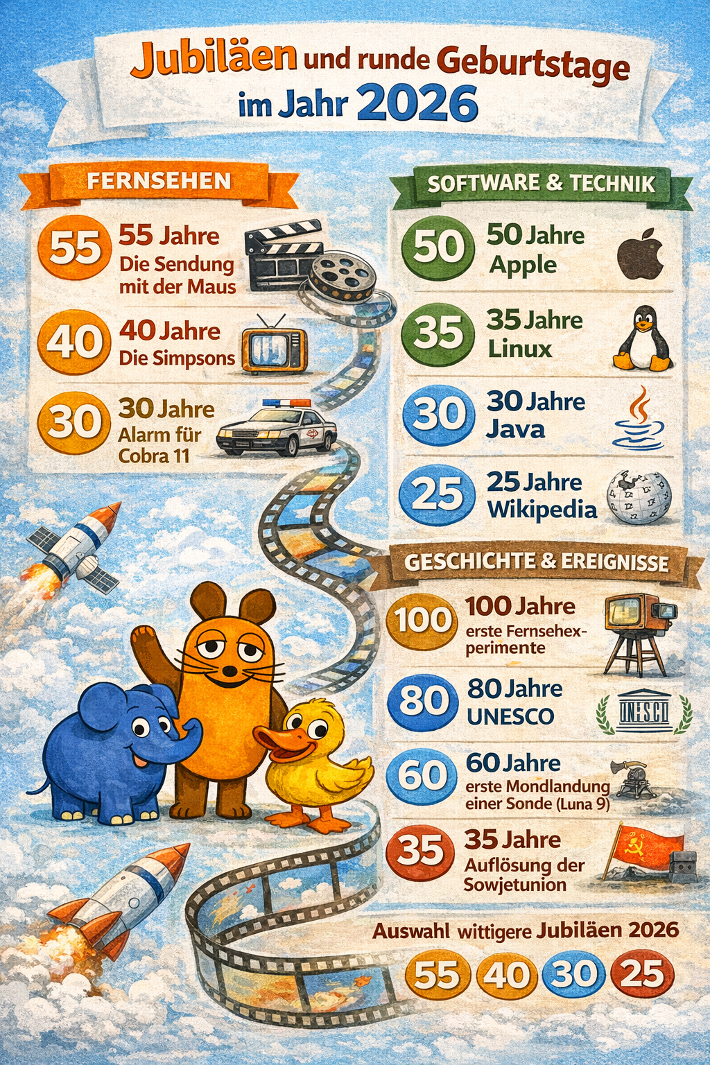 Ein besonderer Blick gilt dem Fernsehen. Die „Sendung mit der Maus“ wird 2026 55 Jahre alt. Seit 1971 erklärt sie Generationen von Kindern – und Erwachsenen – die Welt und gilt bis heute als Vorbild für verständliche Wissensvermittlung.