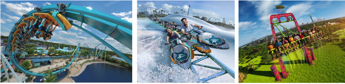 Hoch hinaus mit „Serengeti Flyer“, steil hinab bei einer Fahrt mit „Catapult Falls“ und Wellenreiten auf dem Surfbrett von „Pipeline: The Surf Coaster“
